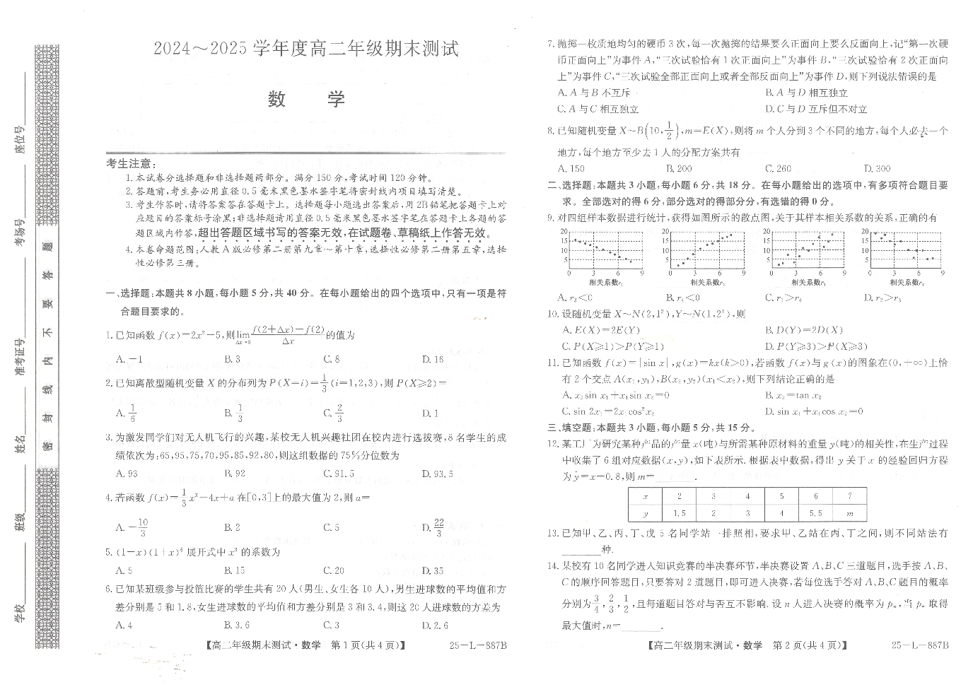 高二数学--河北卓越联盟2024-2025学年度高二年级期末测试