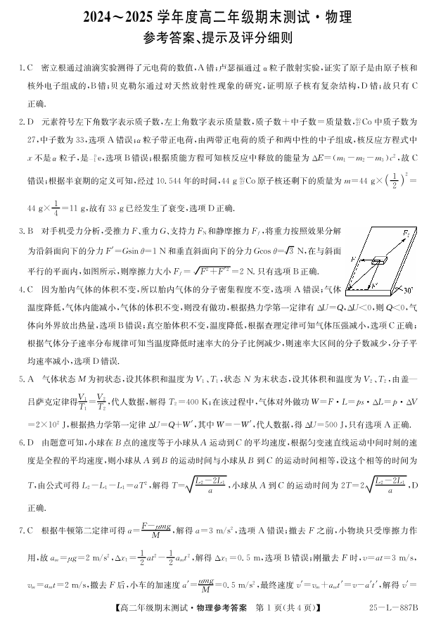 高二物理答案--河北卓越联盟2024-2025学年度高二年级期末测试