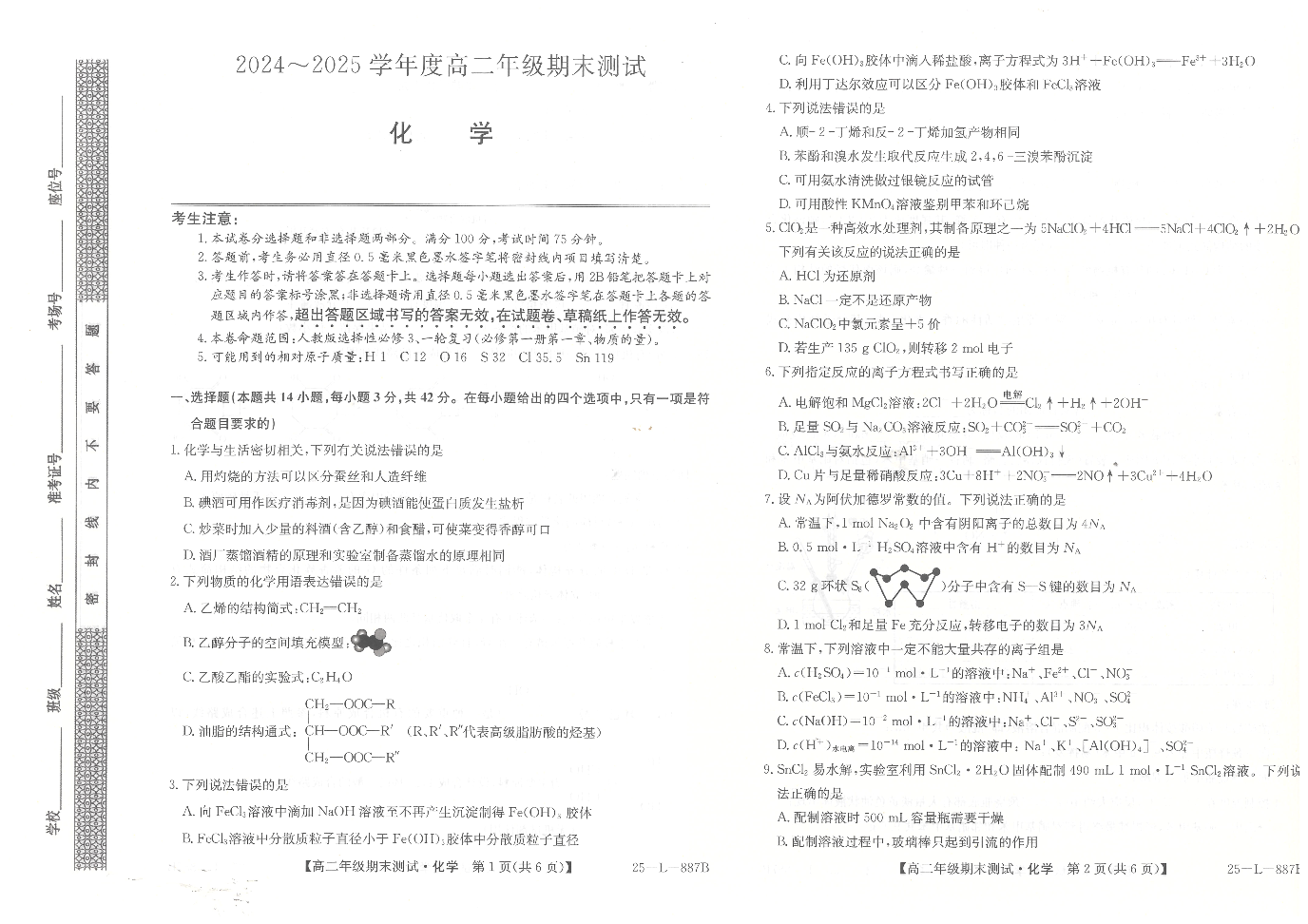 高二化学--河北卓越联盟2024-2025学年度高二年级期末测试