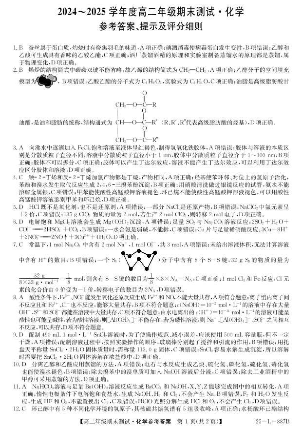 高二化学答案--河北卓越联盟2024-2025学年度高二年级期末测试