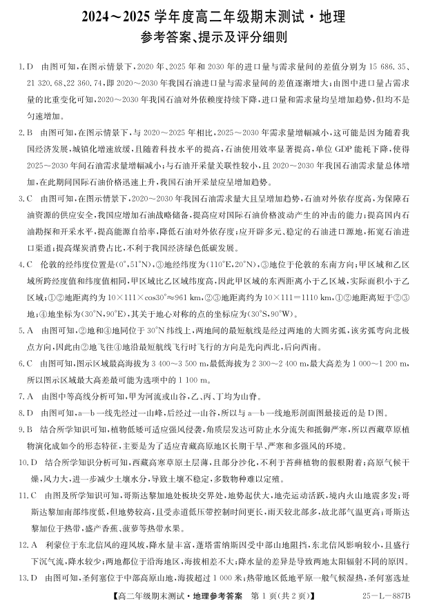 高二地理答案--河北卓越联盟2024-2025学年度高二年级期末测试