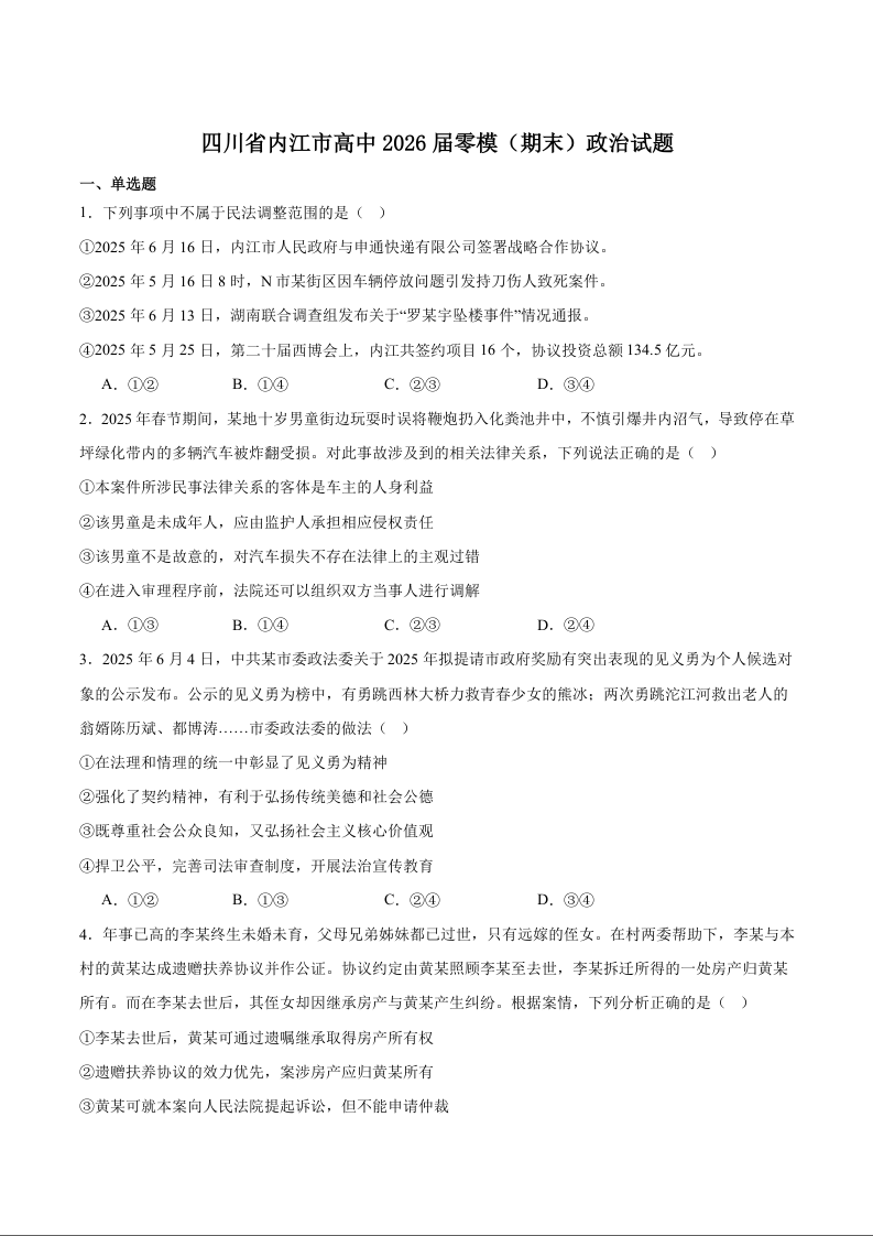 高二政治+答案--四川省内江市2026届高三上学期学期零模(高二下学期期末)