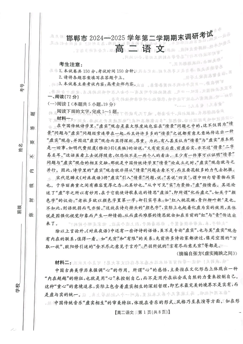 河北省邯郸市2024-2025学年高二下学期期末调研考试语文