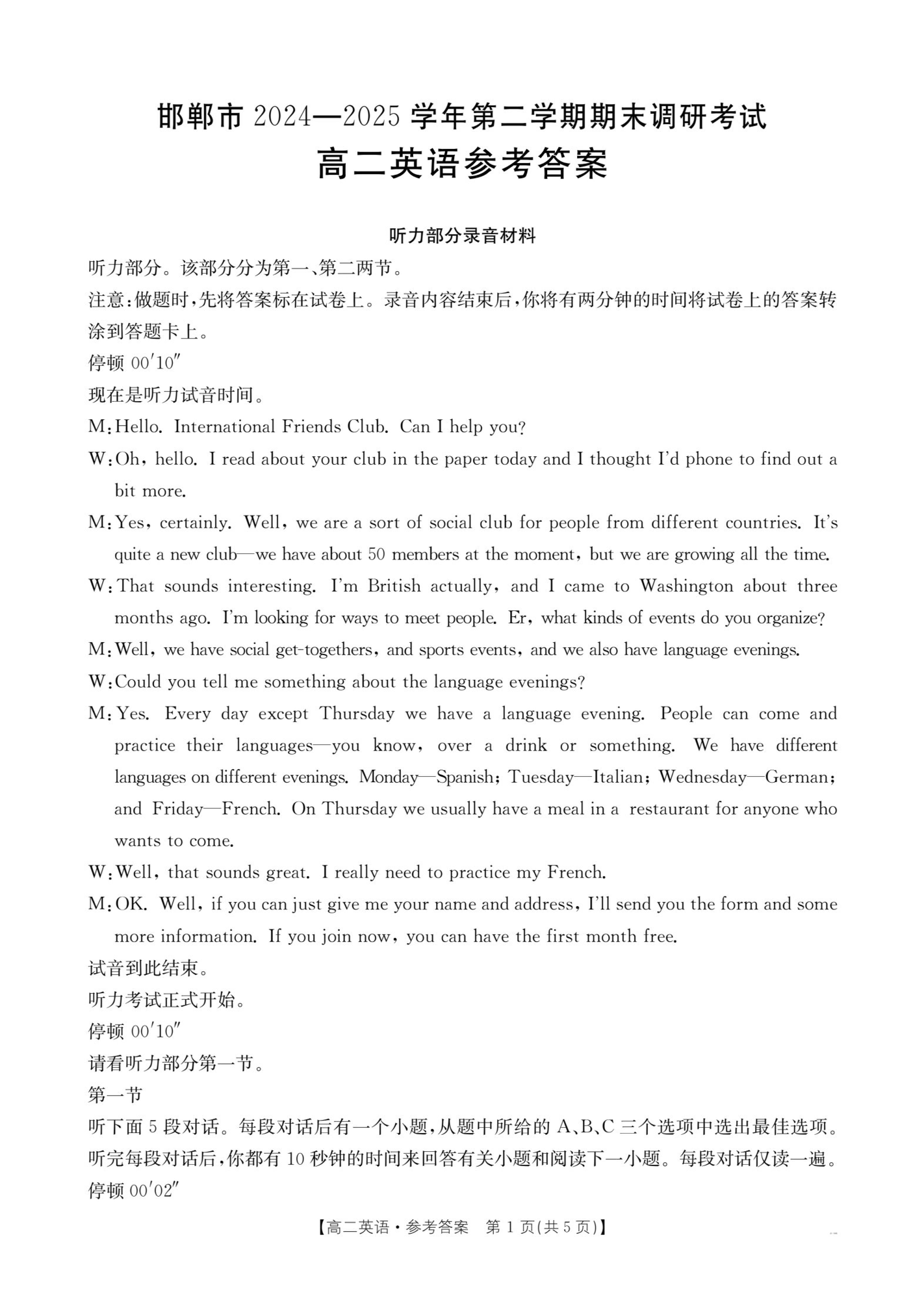 河北省邯郸市2024-2025学年高二下学期期末调研考试英语答案