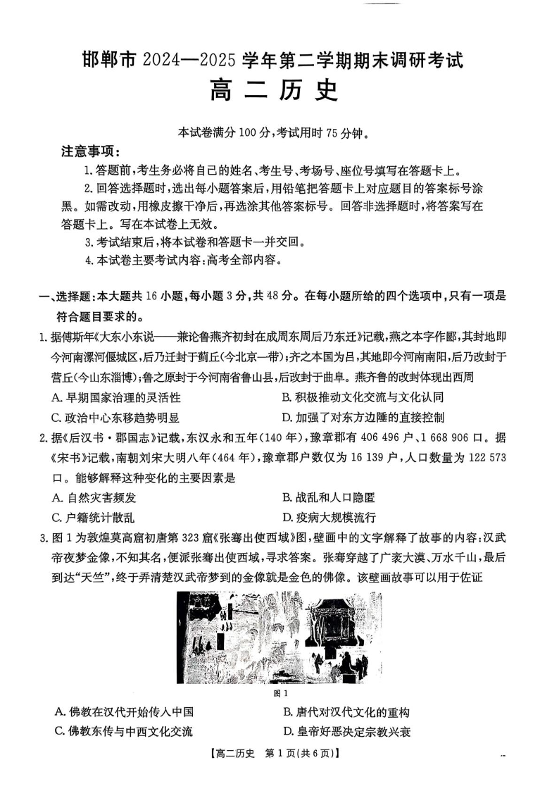 河北省邯郸市2024-2025学年高二下学期期末调研考试历史+答案