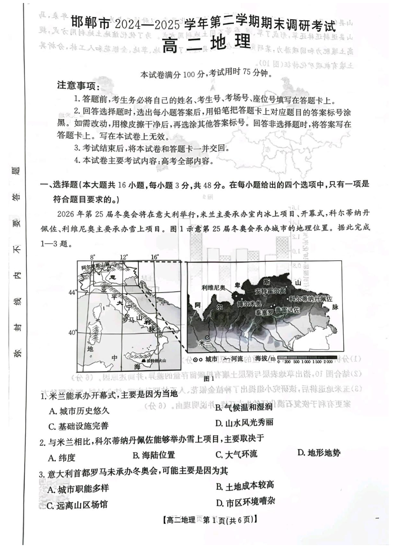 河北省邯郸市2024-2025学年高二下学期期末调研考试地理+答案