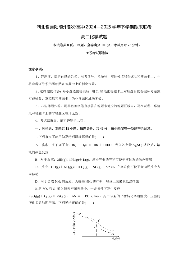 湖北省襄阳市随州部分高中2024-2025学年高二下学期期末联考化学