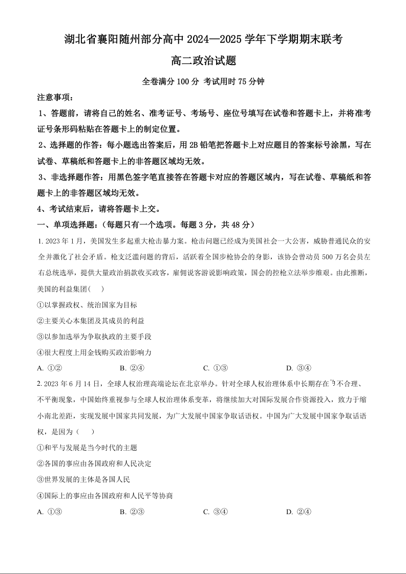 湖北省襄阳市随州部分高中2024-2025学年高二下学期期末联考政治(原卷版)