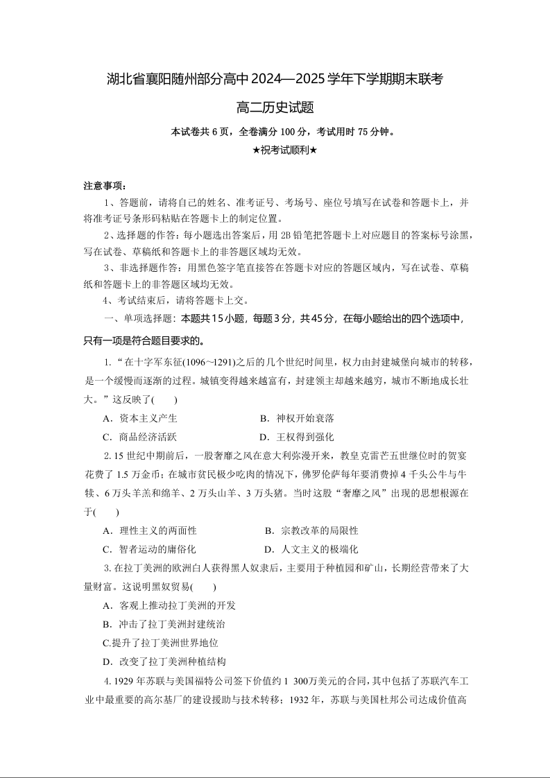 湖北省襄阳市随州部分高中2024-2025学年高二下学期期末联考历史