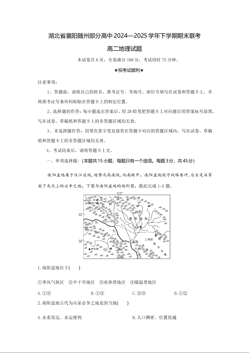 湖北省襄阳市随州部分高中2024-2025学年高二下学期期末联考地理