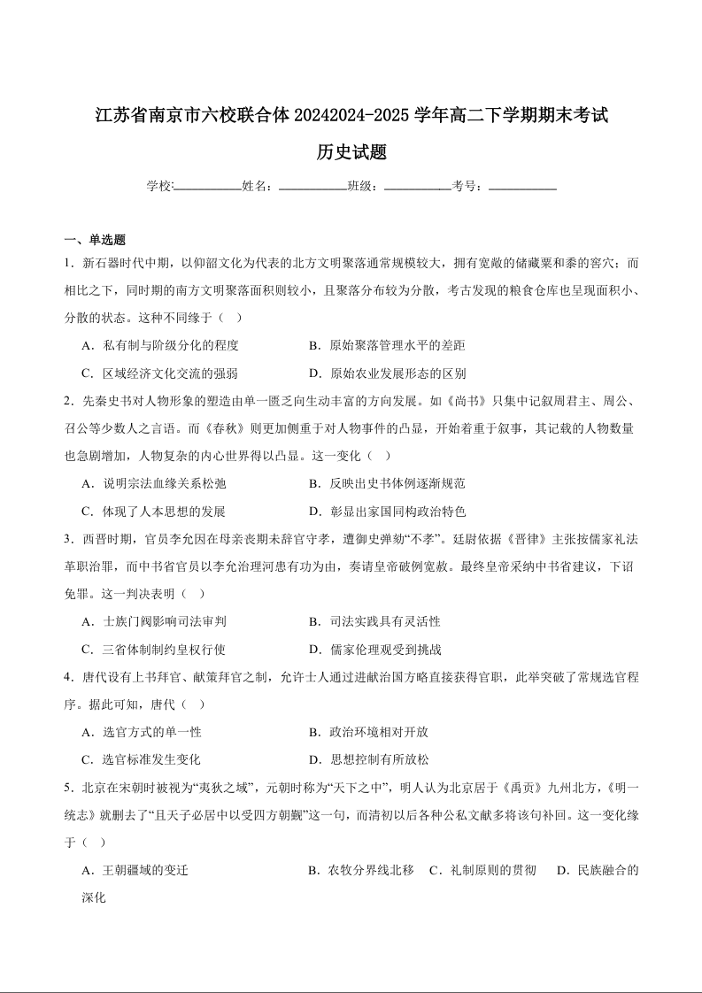 江苏省南京市六校联合体2024-2025学年高二下学期6月期末考试 历史+答案