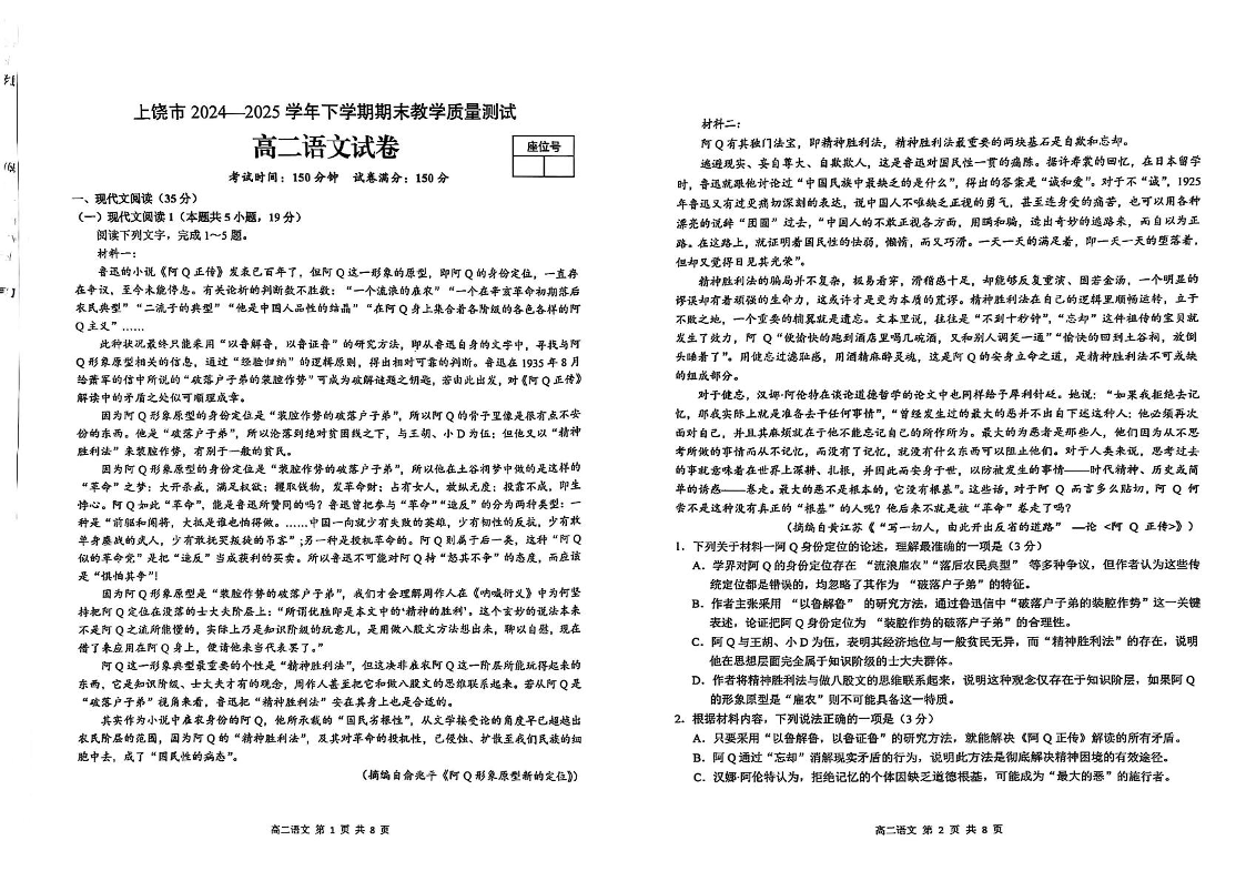 江西省上饶市2024-2025学年下学期期末教学质量检测语文