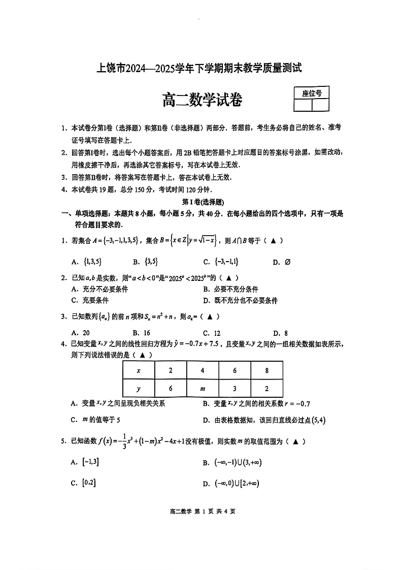 江西省上饶市2024-2025学年下学期期末教学质量检测数学+答案
