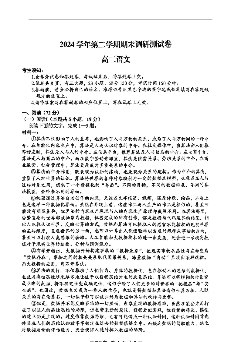 浙江省湖州市2024-2025学年高二下学期期末调研测试语文