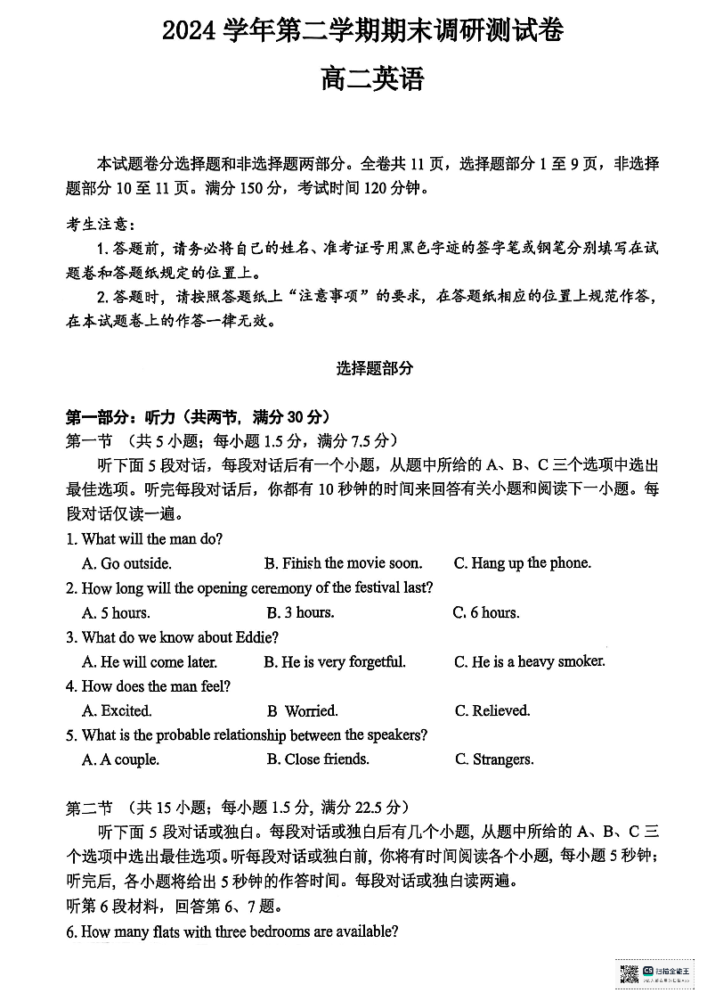 浙江省湖州市2024-2025学年高二下学期期末调研测试英语+答案