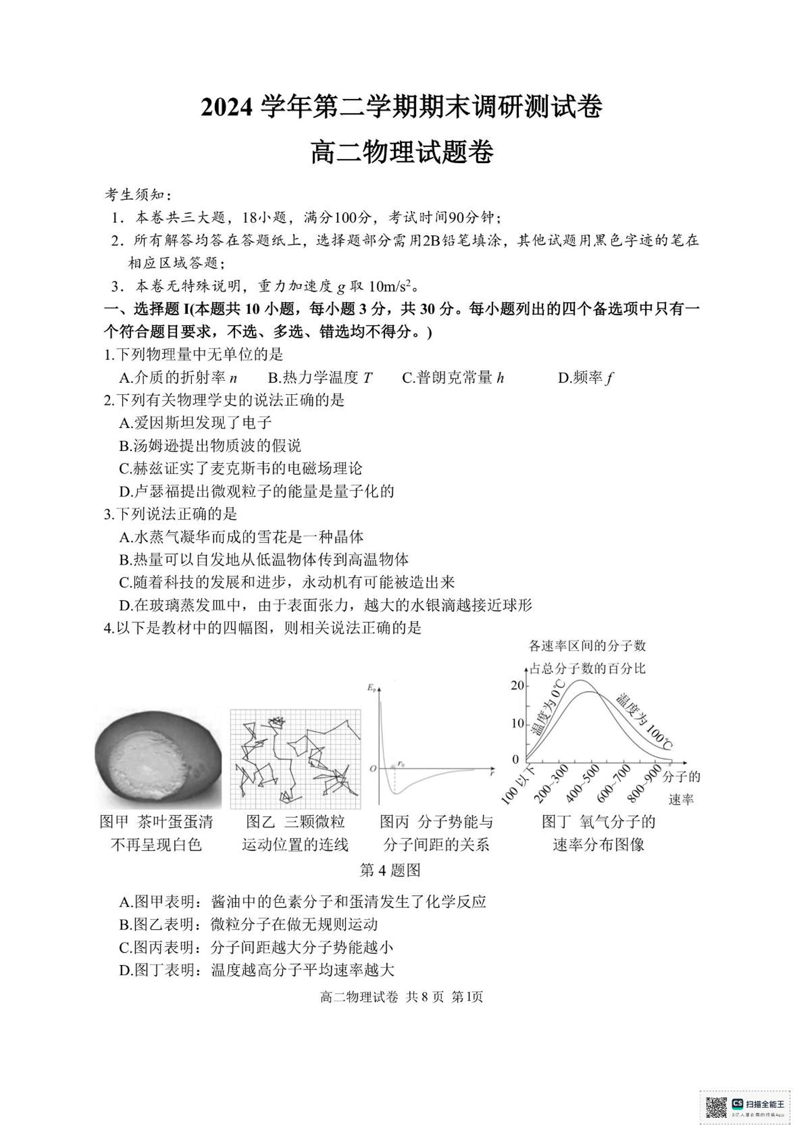 浙江省湖州市2024-2025学年高二下学期6月期末物理+答案