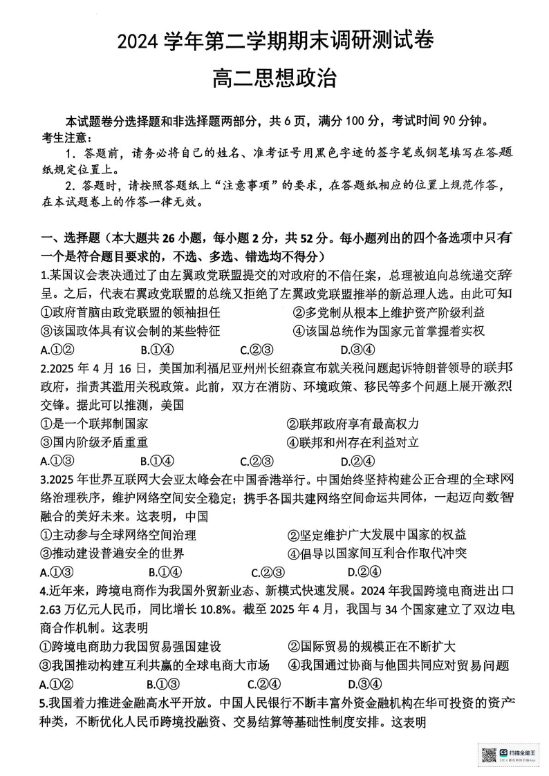 浙江省湖州市2024-2025学年高二下学期6月期末政治+答案