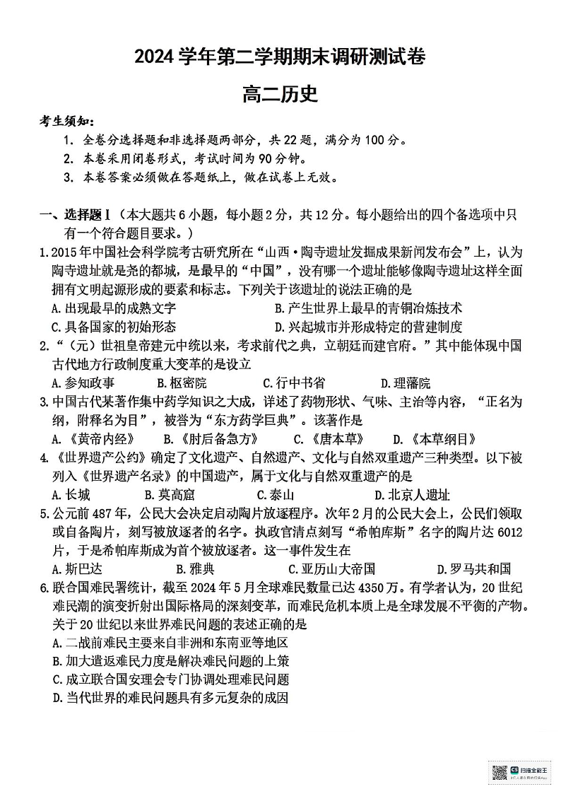 浙江省湖州市2024-2025学年高二下学期6月期末历史+答案