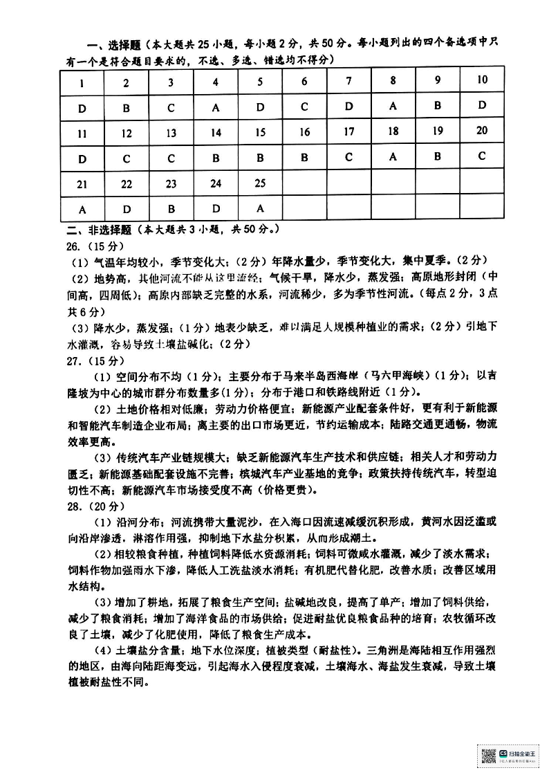 浙江省湖州市2024-2025学年高二下学期期末调研测试地理答案