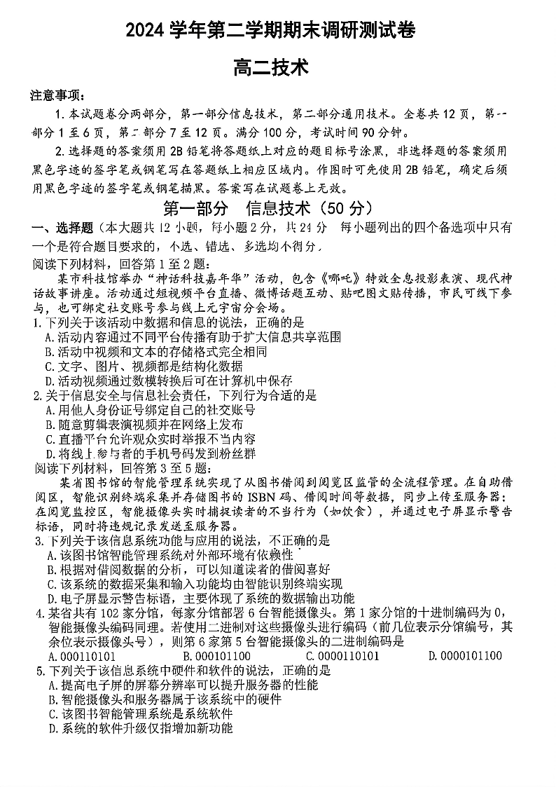 浙江省湖州市2024-2025学年高二下学期6月期末技术