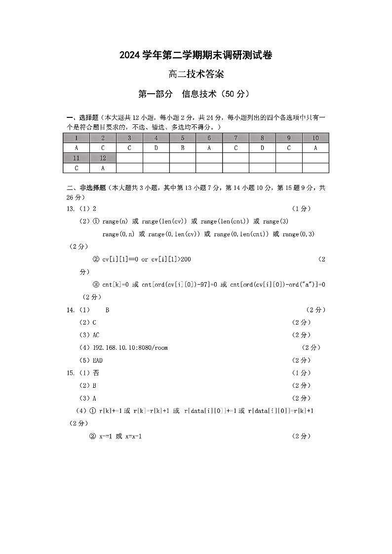 浙江省湖州市2024-2025学年高二下学期6月期末技术答案