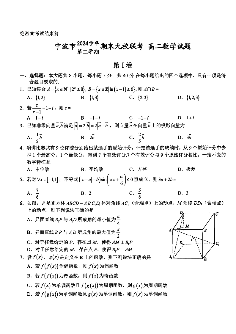 浙江宁波市九校2025年高二下学期6月期末数学+答案