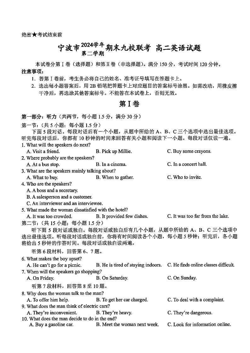 浙江宁波市九校2025年高二下学期6月期末英语+答案