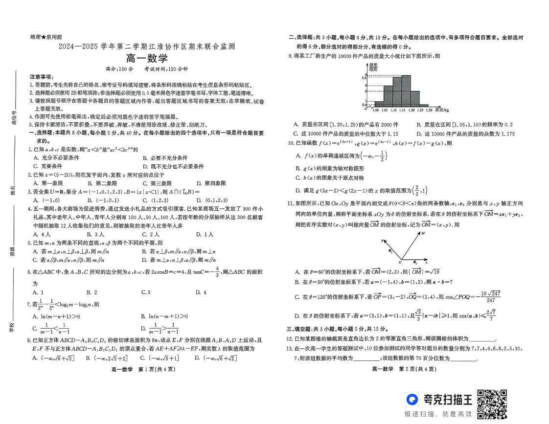 高一数学+答案--安徽省江淮协作区2024-2025学年高一下学期期末联合监测