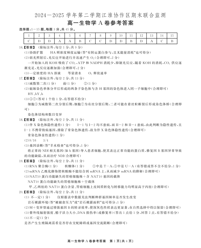 高一生物A答案--安徽省江淮协作区2024-2025学年高一下学期期末联合监测