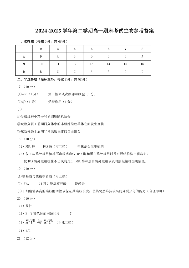 高一生物+答案--河南省许昌市2024-2025学年高一下学期7月期末教学质量检测