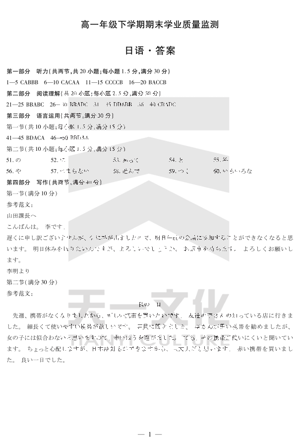 高一日语答案--河南省2024-2025高一年级下学期期末教学质量监测