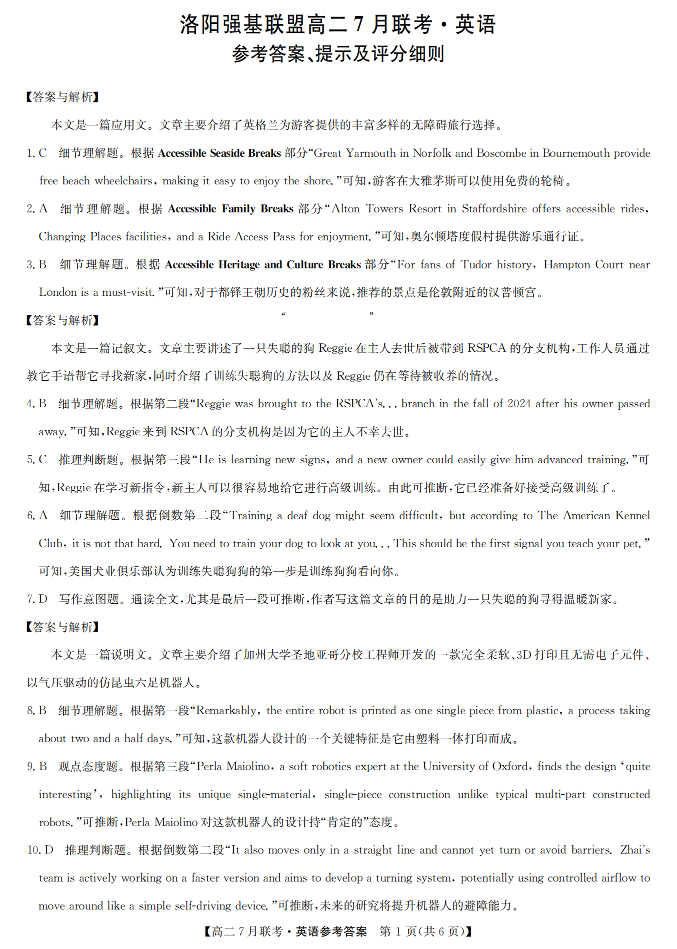 高二英语答案--河南省洛阳市强基联盟2025年7月高二下学期期末联考