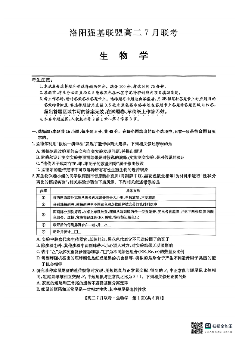 高二生物--河南省洛阳市强基联盟2025年7月高二下学期期末联考