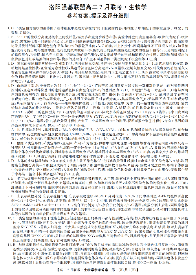 高二生物答案--河南省洛阳市强基联盟2025年7月高二下学期期末联考