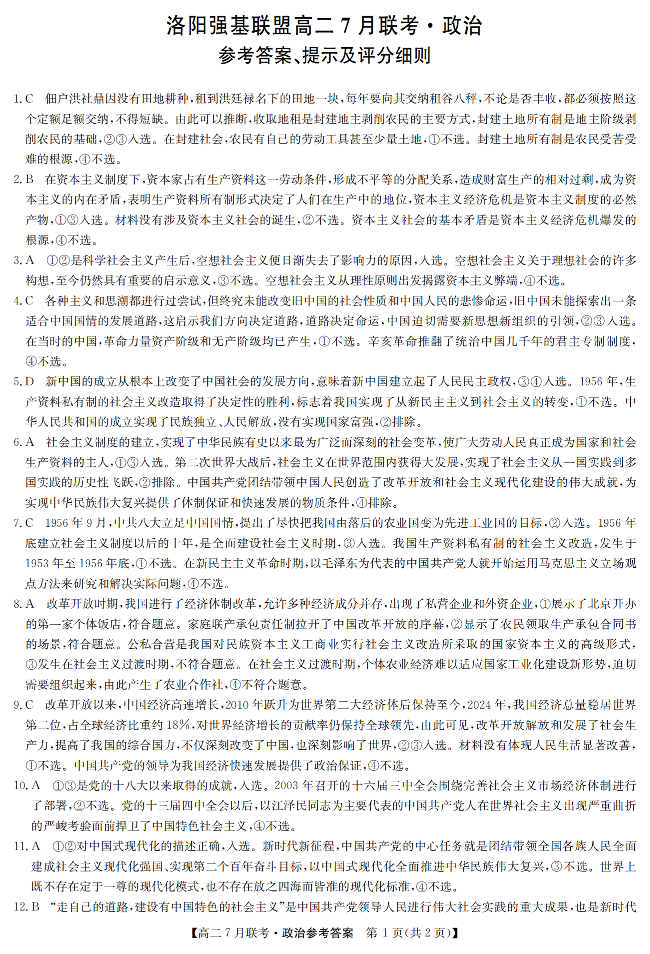 高二政治答案--河南省洛阳市强基联盟2025年7月高二下学期期末联考