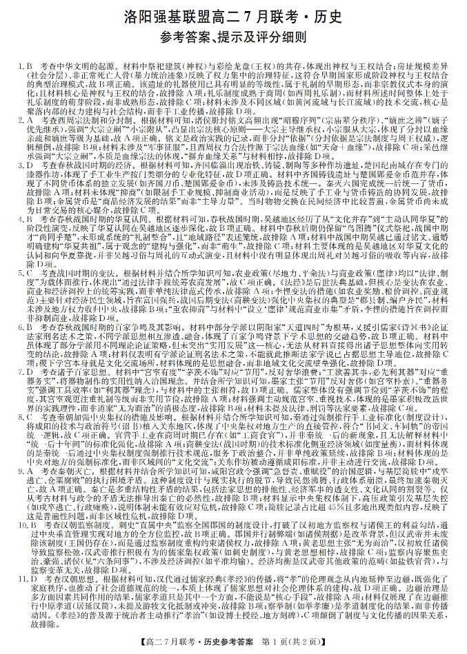 高二历史答案--河南省洛阳市强基联盟2025年7月高二下学期期末联考