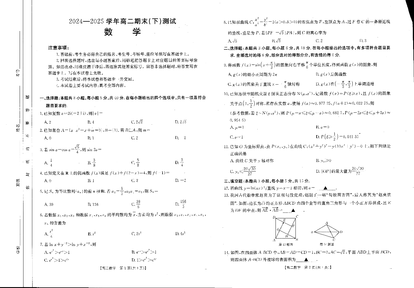高二数学--河南省新乡市2024-2025学年下学期高二金太阳期末考试