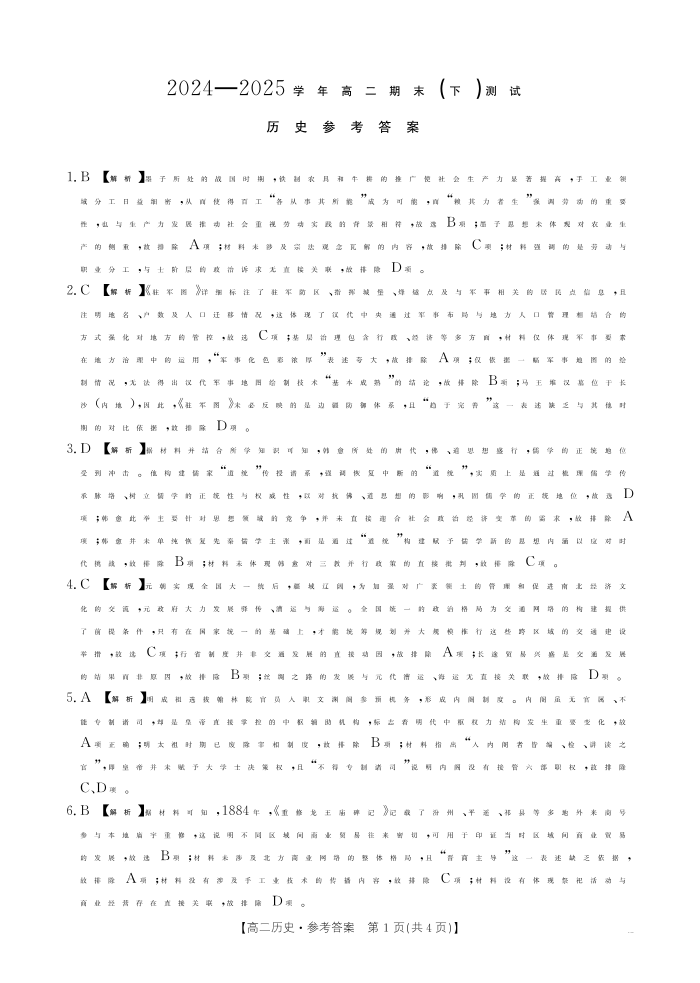高二历史答案--河南省新乡市2024-2025学年下学期高二金太阳期末考试