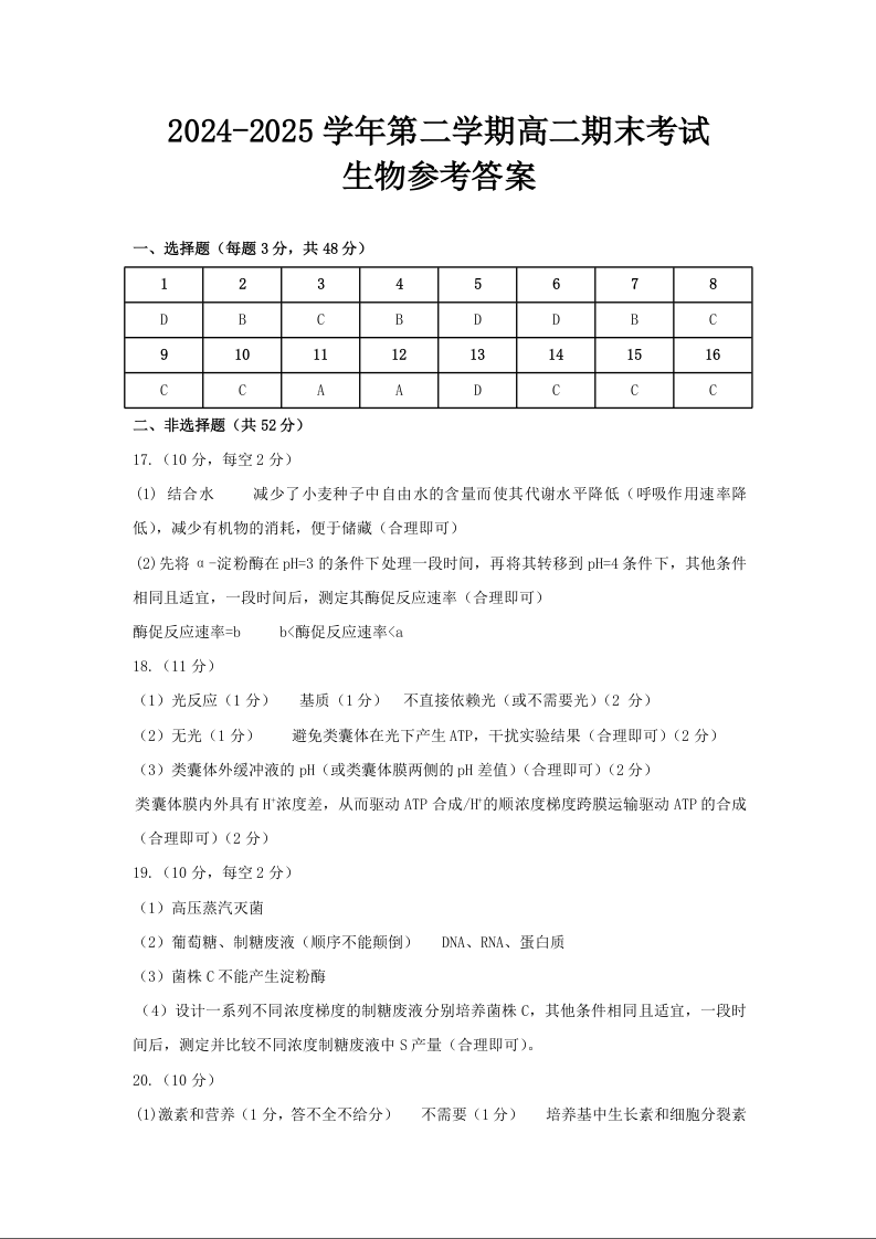 高二生物答案--河南省许昌市2024-2025学年高二下学期7月期末教学质量检测