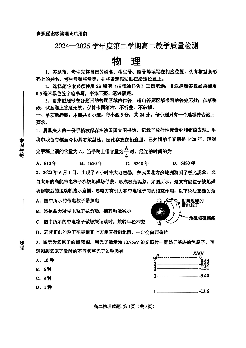 高二物理--山东省淄博市2026届第二学期高二教学质量检测