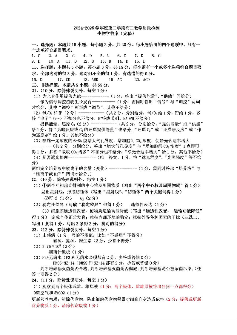 高二生物答案--山东省淄博市2026届第二学期高二教学质量检测