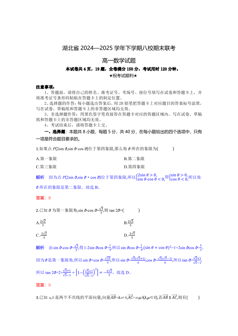 湖北省八校联考2024-2025学年高一下学期期末联考数学(解析版)