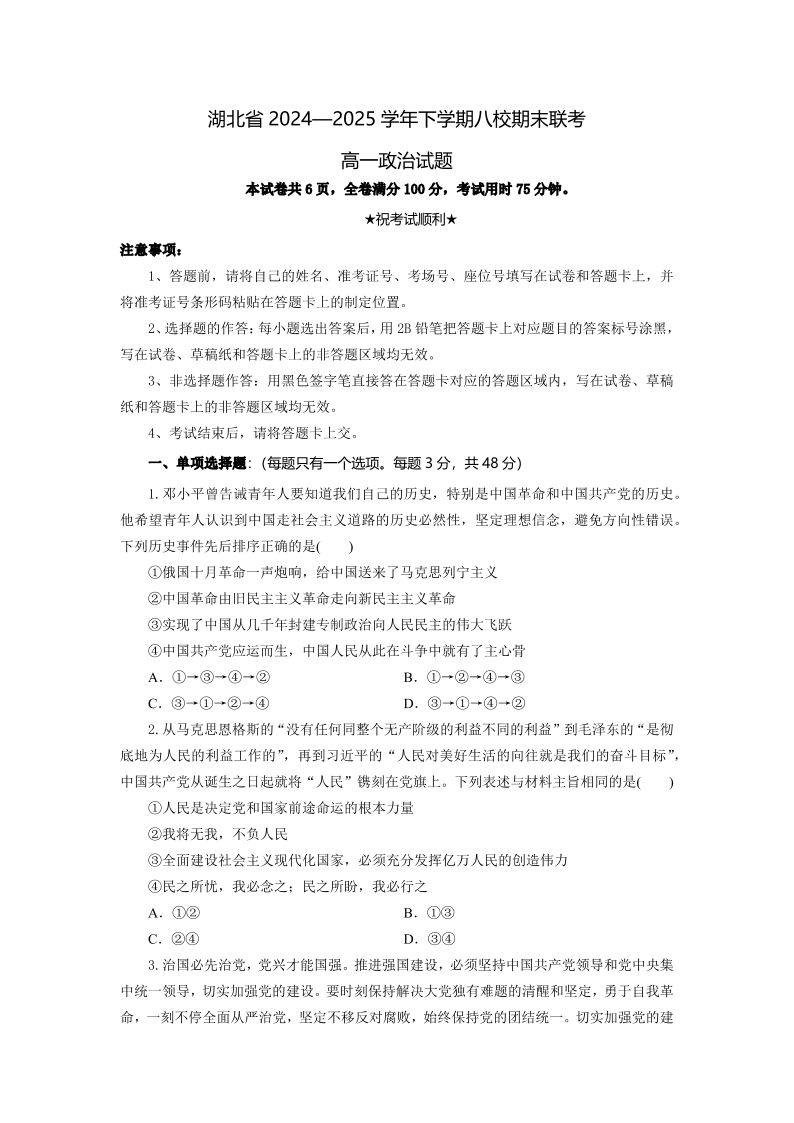 湖北省八校联考2024-2025学年高一下学期期末联考政治