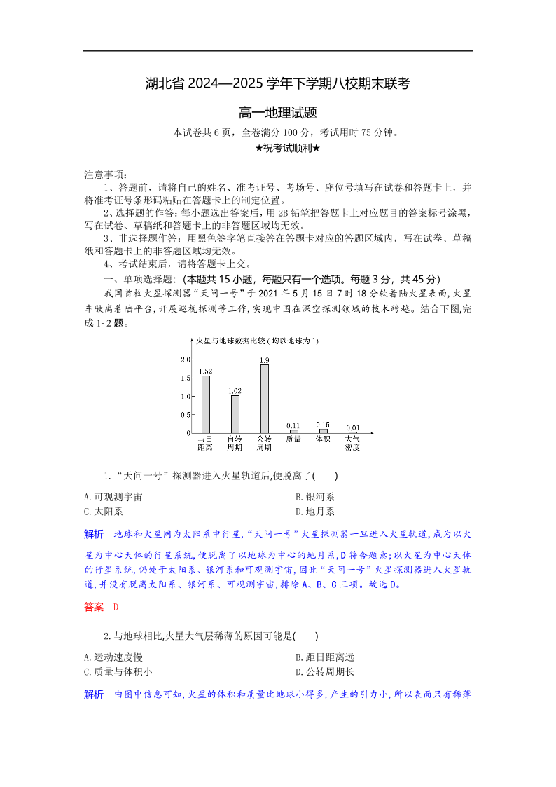 湖北省八校联考2024-2025学年高一下学期期末联考地理(解析版)