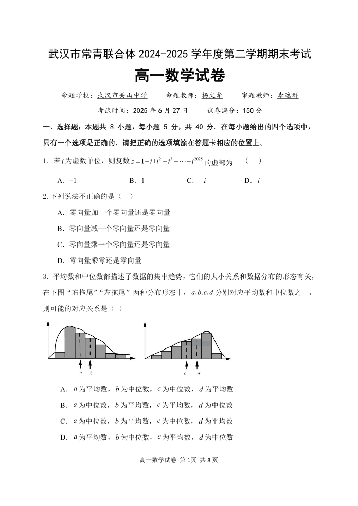 湖北省武汉市常青联盟2024-2025学年度下学期高一年级6月联考数学