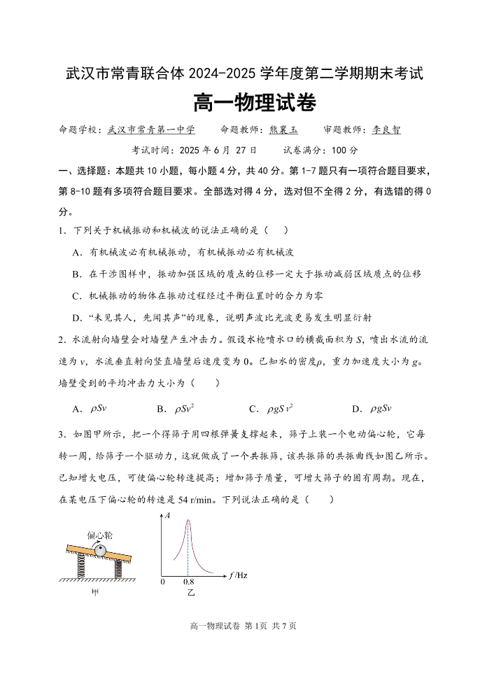 湖北省武汉市常青联盟2024-2025学年度下学期高一年级6月联考物理
