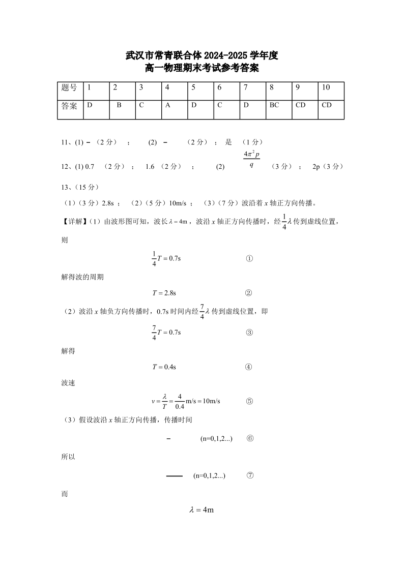 湖北省武汉市常青联盟2024-2025学年度下学期高一年级6月联考物理答案