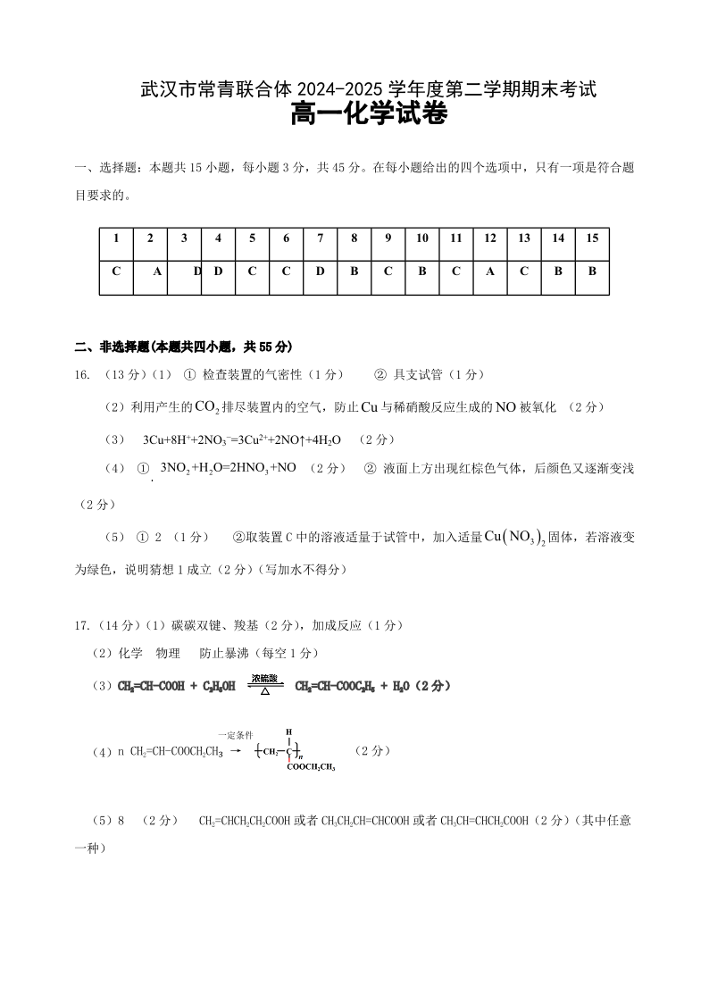 湖北省武汉市常青联盟2024-2025学年度下学期高一年级6月联考化学答案