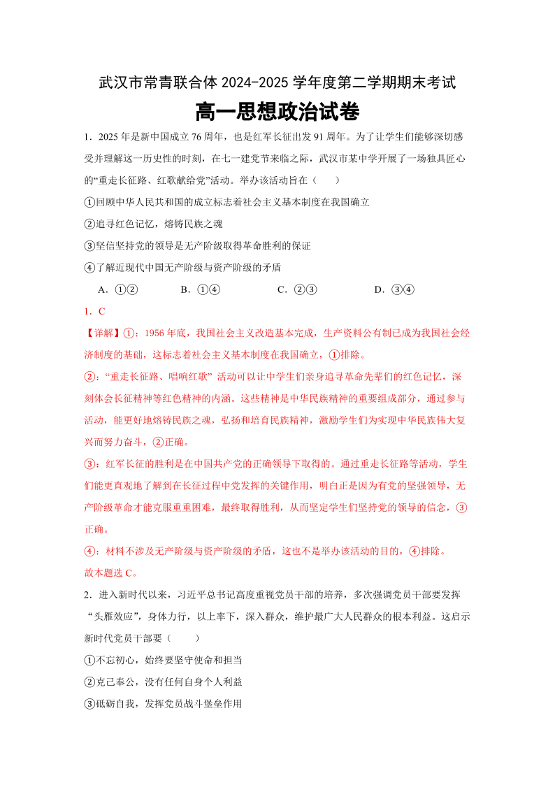 湖北省武汉市常青联盟2024-2025学年度下学期高一年级6月联考政治答案