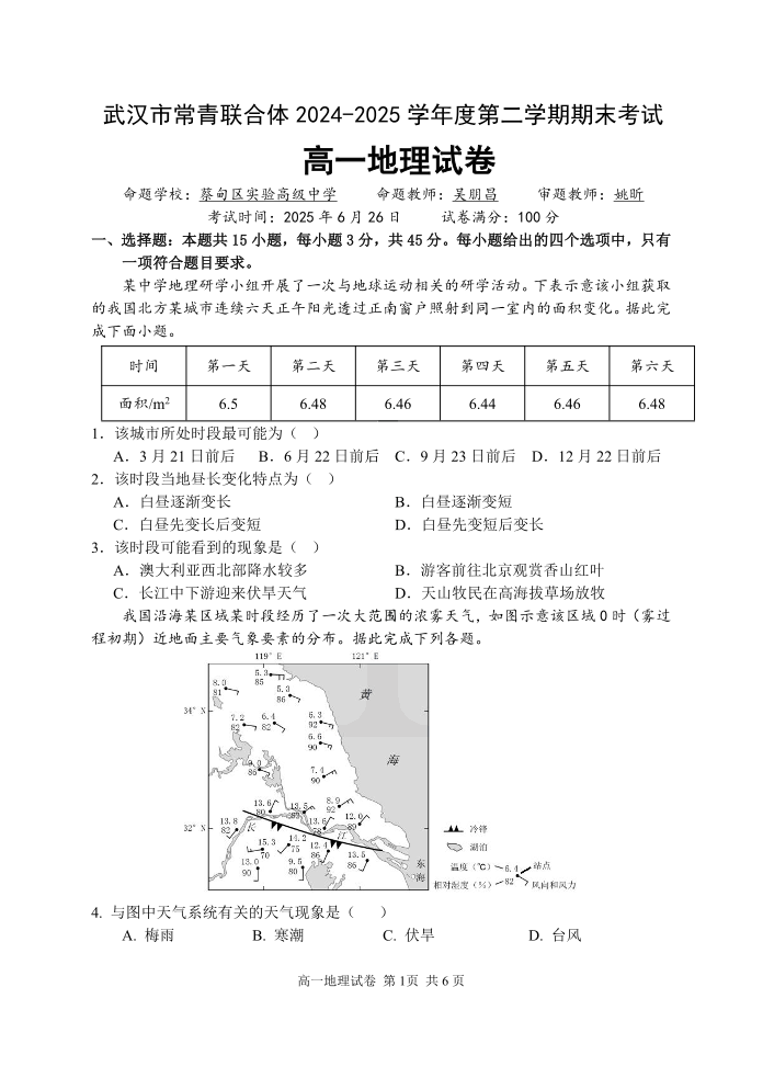 湖北省武汉市常青联盟2024-2025学年度下学期高一年级6月联考地理